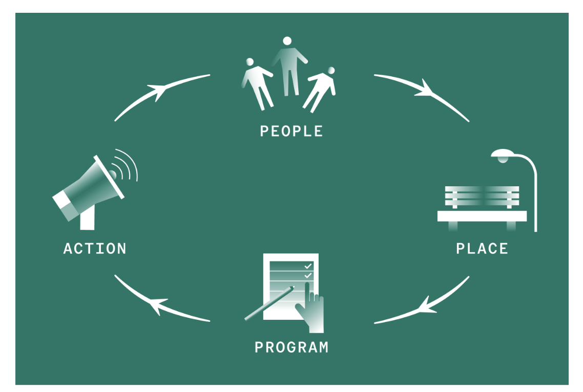実証実験等を通じてエリア内の緑地、公園、道路、公開空地などの新たな利活用のあり方を検討し、賑いを「面」に拡大する取組を進めます。こうした取り組みを通じてエリア全面をウォーカブルな環境に整備することで、人中心の居心地の良い空間を作るための未来ビジョンを策定していきます。