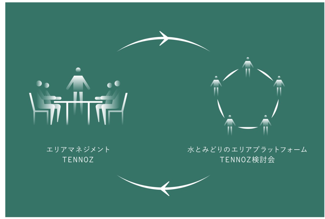 「一般社団法人エリアマネジメントTENNOZ」と「品川区」とで構成され、天王洲アイルの価値向上のための様々な施策を立案します。エリアマネジメントTENNOZが施策の実行主体として活動しながら、その知見を踏まえてエリアプラットフォームで天王洲アイルの未来ビジョンを議論し、新たなまちづくりのための検討活動体制を構築していきます。
